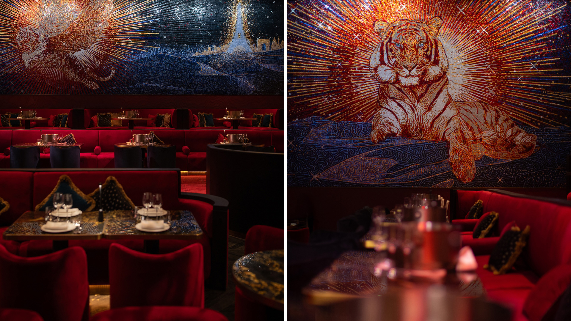 The visual centerpiece is a striking bespoke tiger mosaic by renowned Italian atelier SICIS, which required over 1,000 hours of careful craftsmanship and depicts a flying tiger traveling from Paris to Dubai's Burj Khalifa, symbolizing the cabaret's journey across continents.