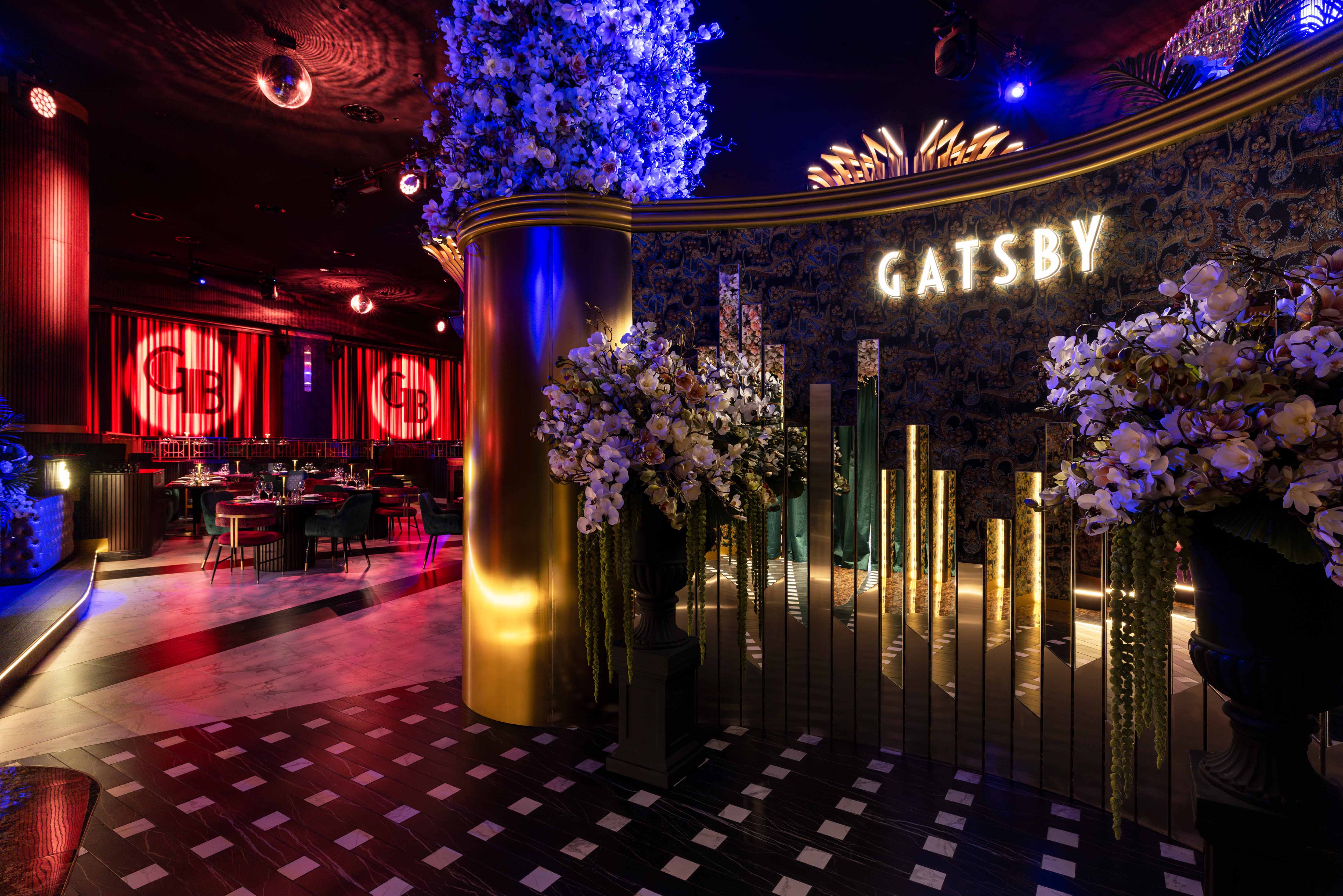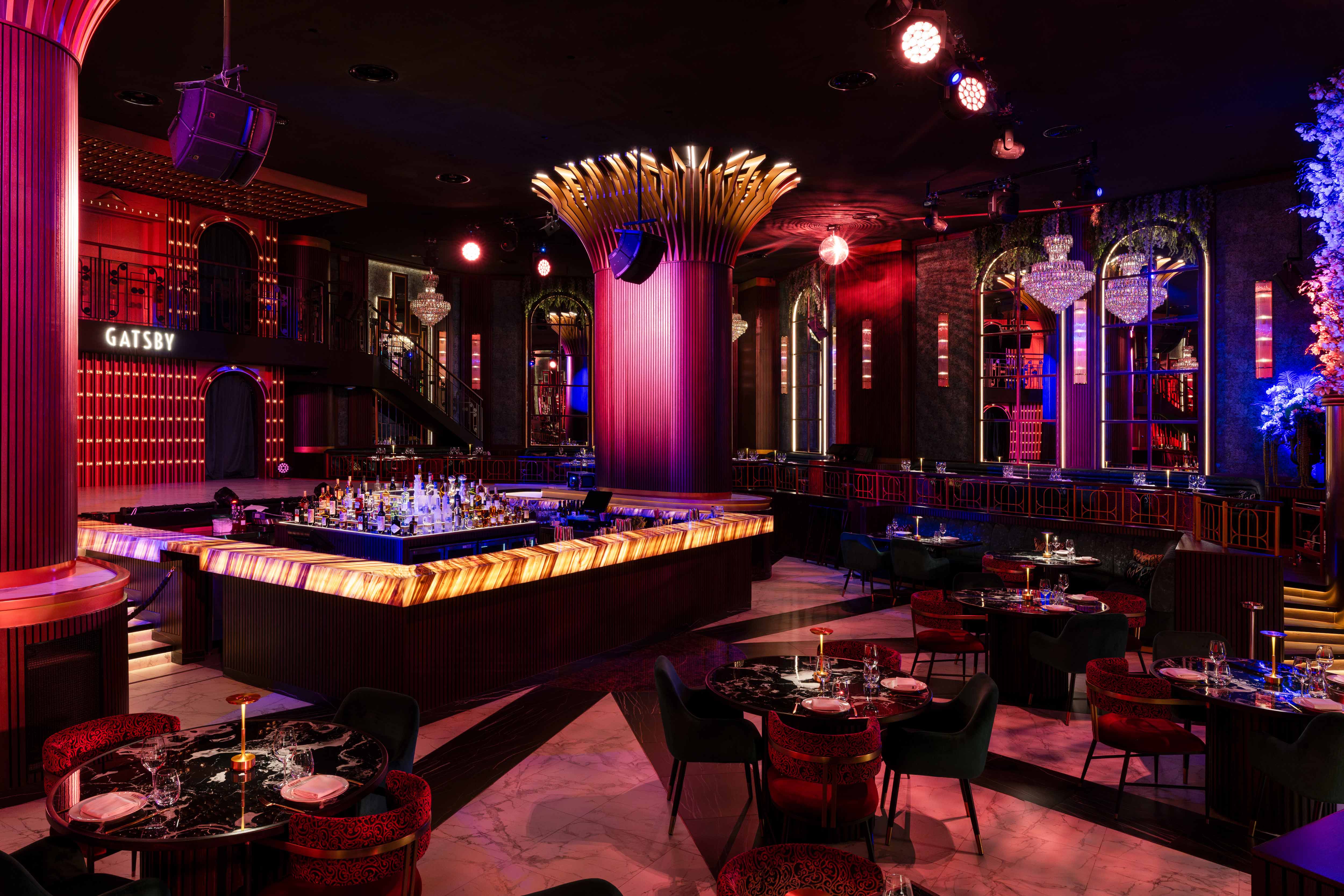 Key interior highlights include eye-catching chandeliers, illuminated pillars, a striking bar centerpiece, and a plush lounge area surrounded by lush greenery. As the evening progresses, Gatsby Dubai transforms into a lively late-night club, with upbeat pop and classic tunes filling the air until dawn.
