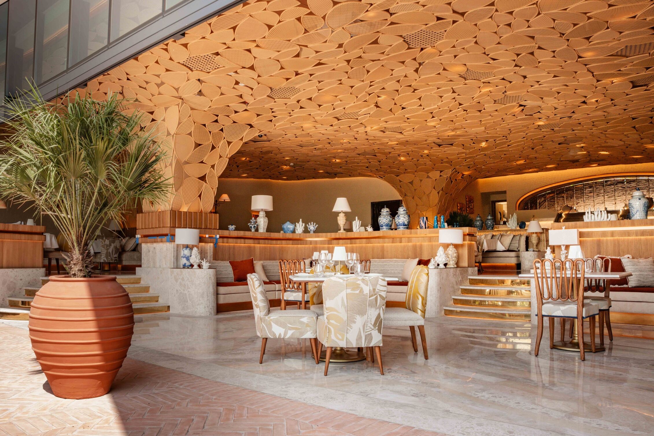 Designed by Verhaal Studios and brought to life by A&T, KIRA’s interiors harmoniously blend Mediterranean warmth with Japanese serenity. The design features hand-painted blue ornaments, Italian mosaics, and Japanese tapestries, all elevated by golden kintsugi-inspired accents that celebrate the beauty of imperfection.