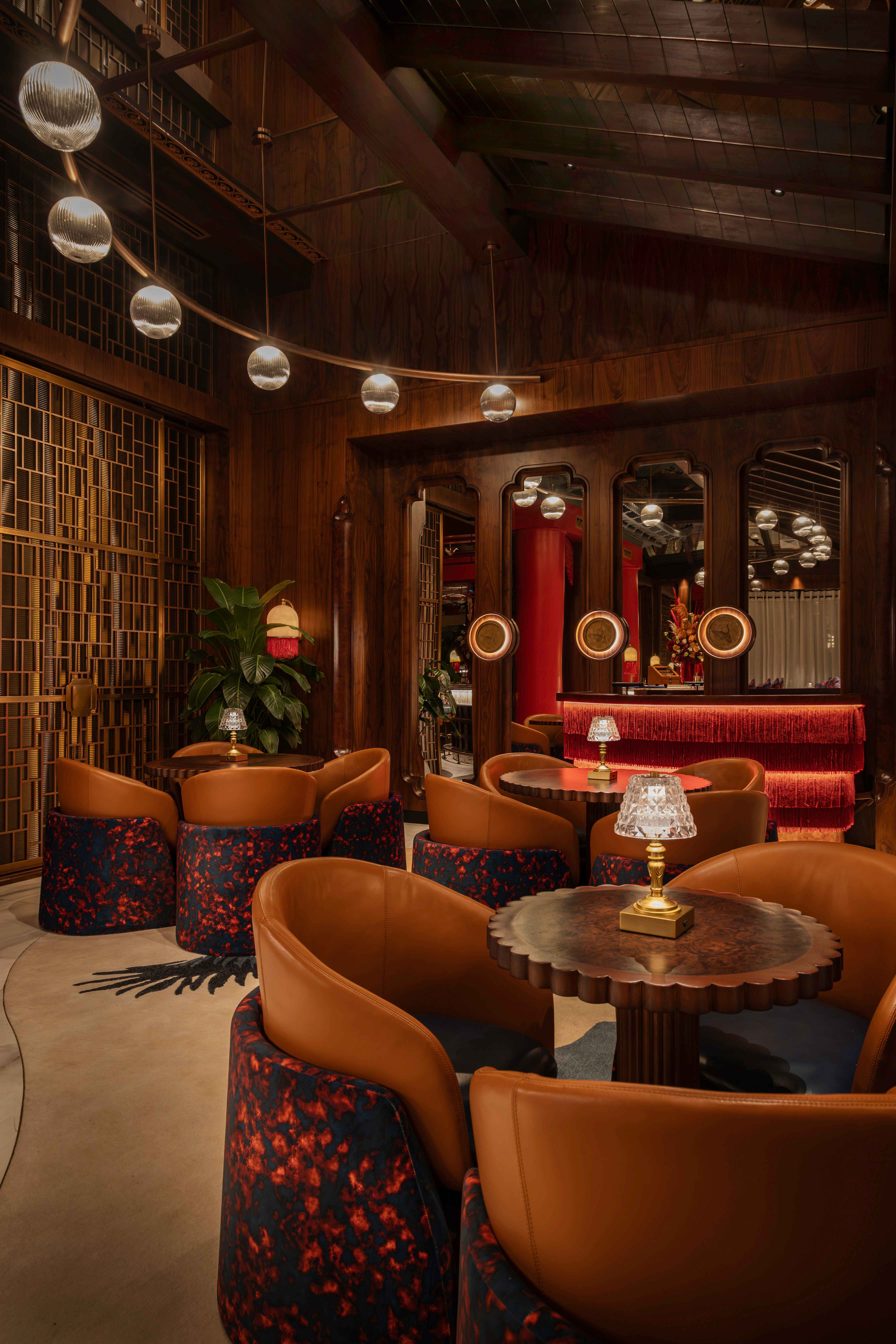 prosperity red and complementary warm tones appear throughout the seating areas.