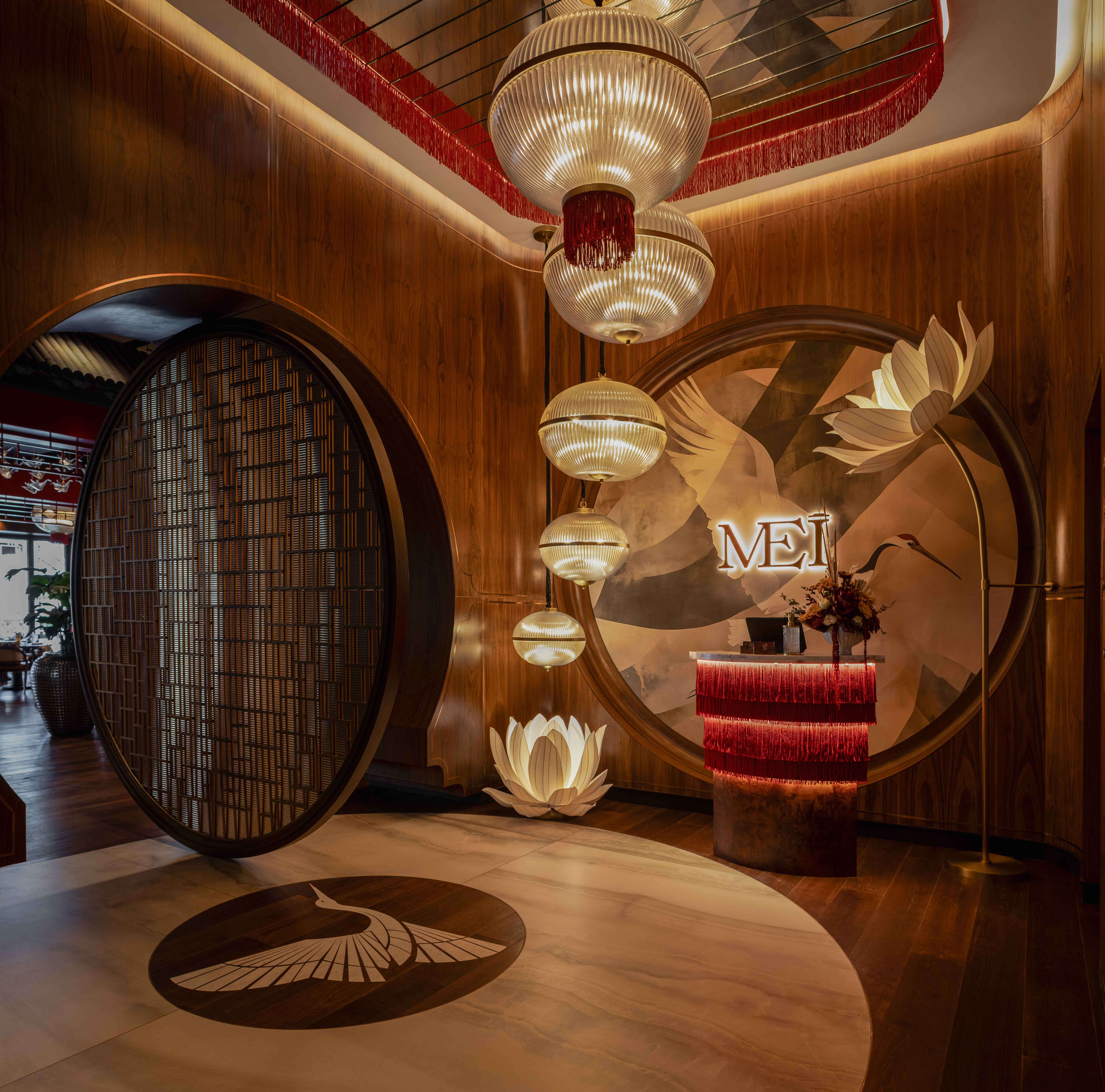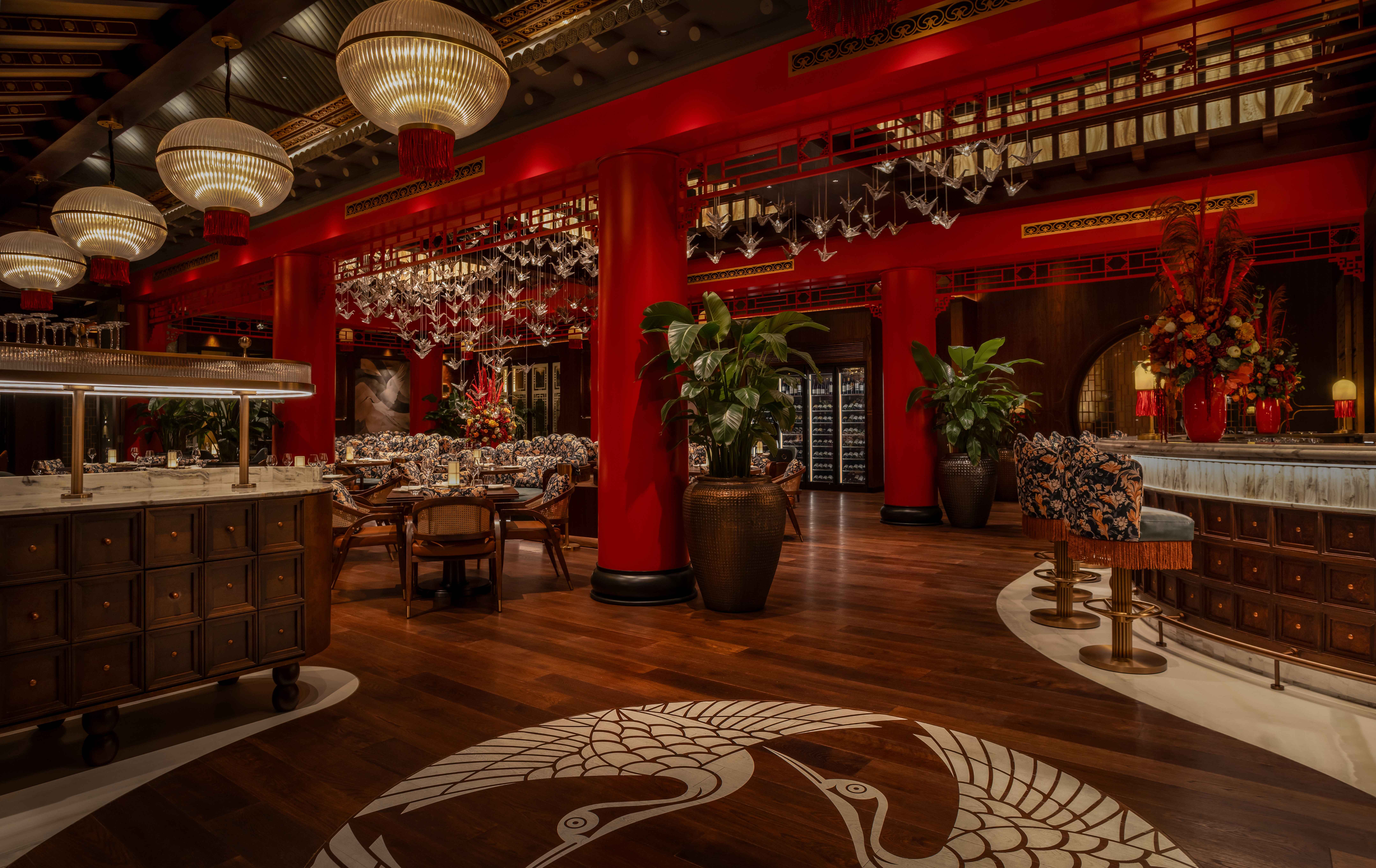 Key design elements include abstract murals with crane motifs, custom woodwork details, a suspended